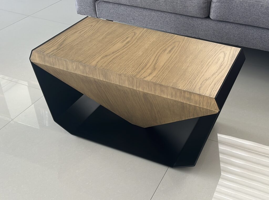 CoffeeK ist ein skulpturaler Kaffeetisch, inspiriert von der Eleganz einer umgedrehten Pyramide. Die warme Holzoberfläche schwebt über einer präzise gefalteten, dunklen Basis und erzeugt ein kraftvolles Zusammenspiel aus Geometrie und Leichtigkeit. Seine facettierte Form verleiht jedem Raum einen architektonischen Akzent. Ein zeitloses Designstück für Menschen, die das Außergewöhnliche suchen.
